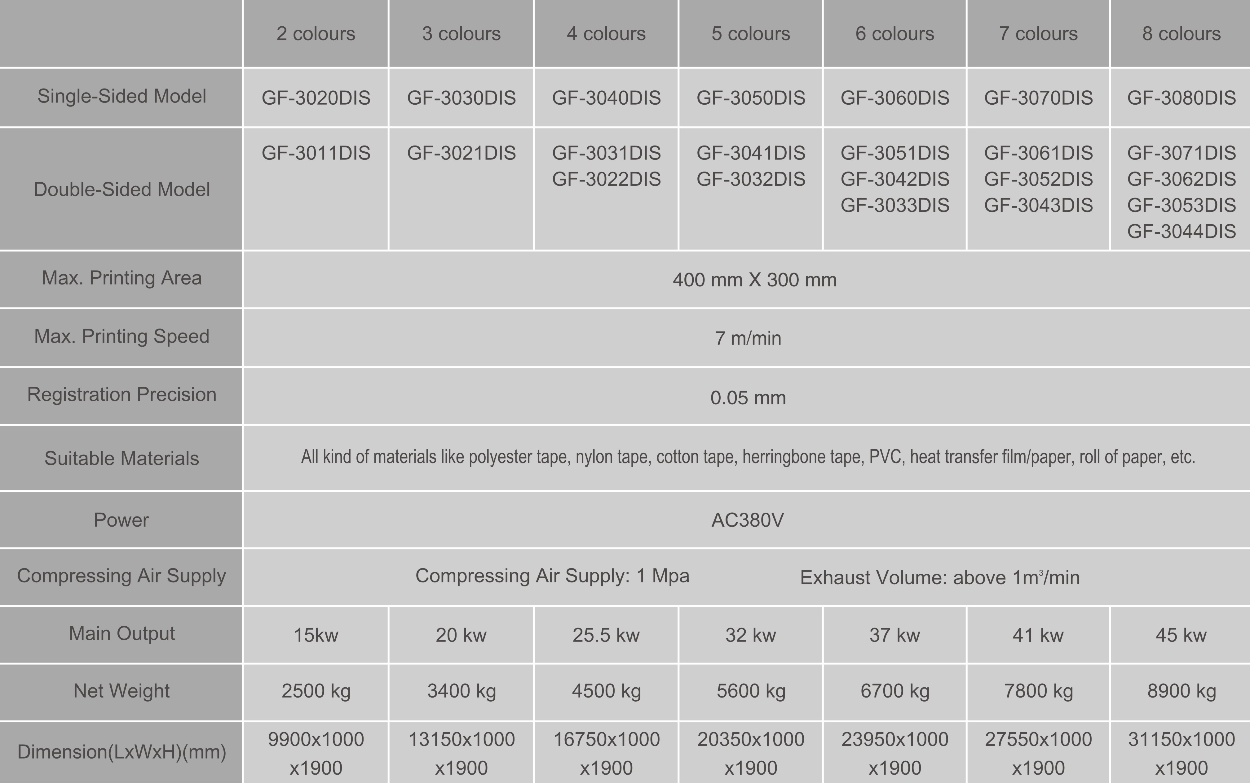 We are able to offer three types of screen printing machine, the GF-3100 Simplified Version, the GF-3000DI the standard version, and the GF-3000DIS the registration tracking version.