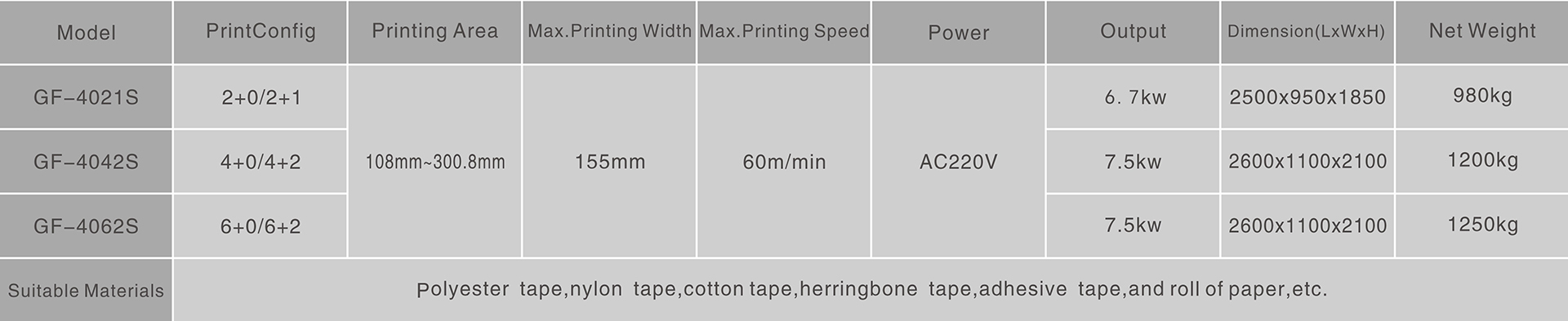 We are able to offer three types of textile label printing machine, the GF-1000 Dri-Offset Rotary Printing Machine, the GF-4000 Flexo Label Printing Machine and the GF-4000s Easy Registration Flexo Label Printing Machine.