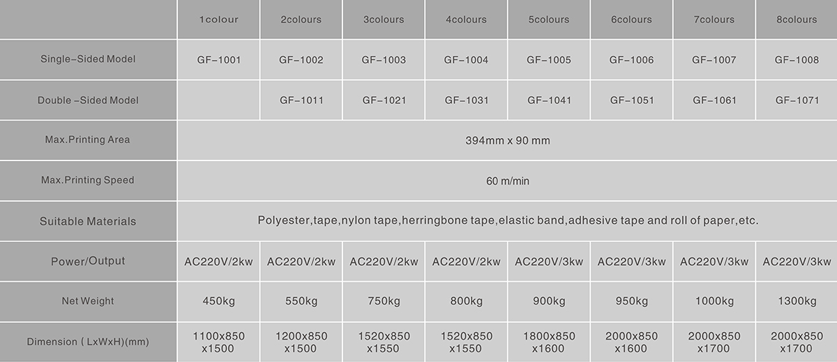 We are able to offer three types of textile label printing machine, the GF-1000 Dri-Offset Rotary Printing Machine, the GF-4000 Flexo Label Printing Machine and the GF-4000s Easy Registration Flexo Label Printing Machine.